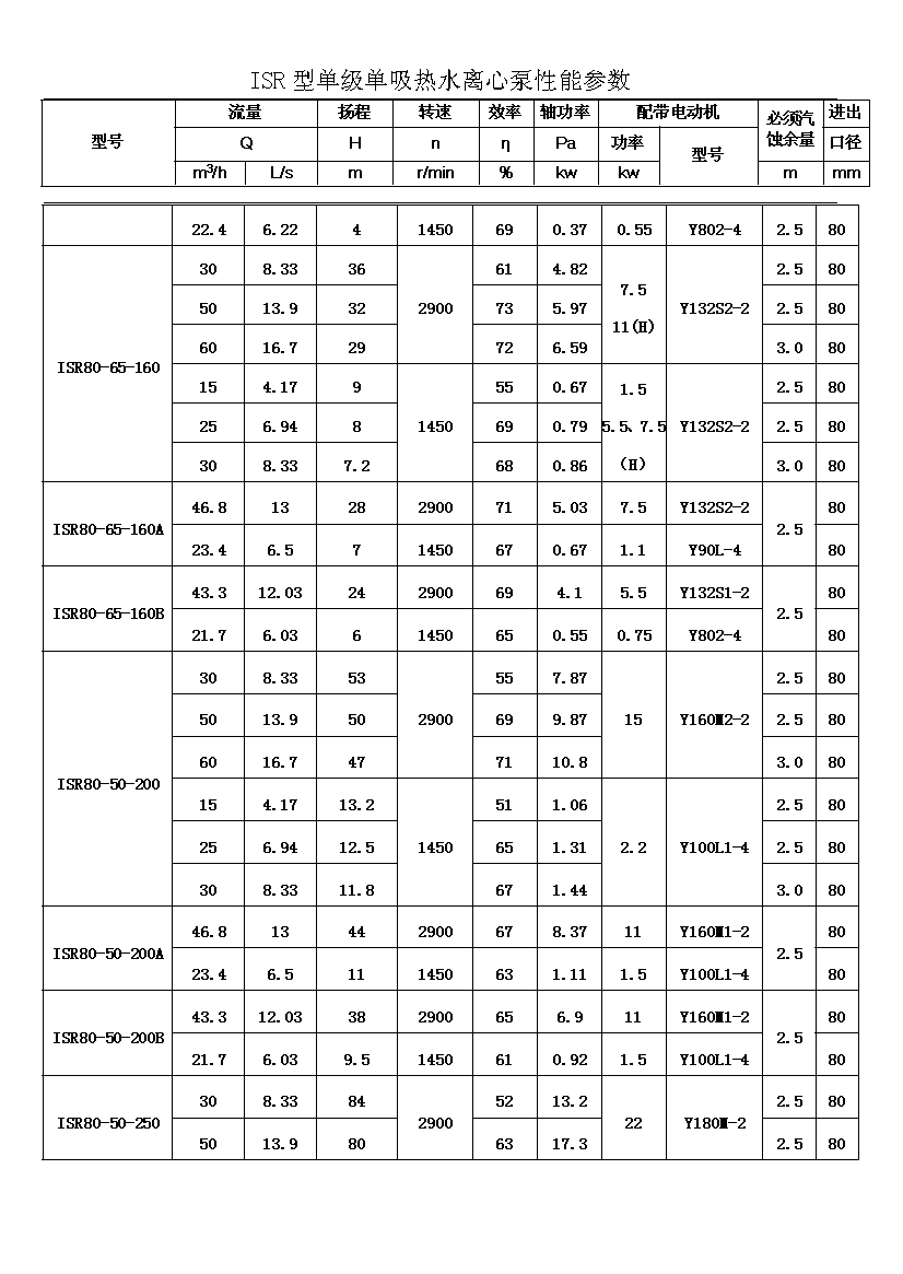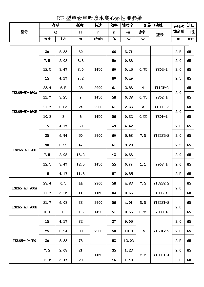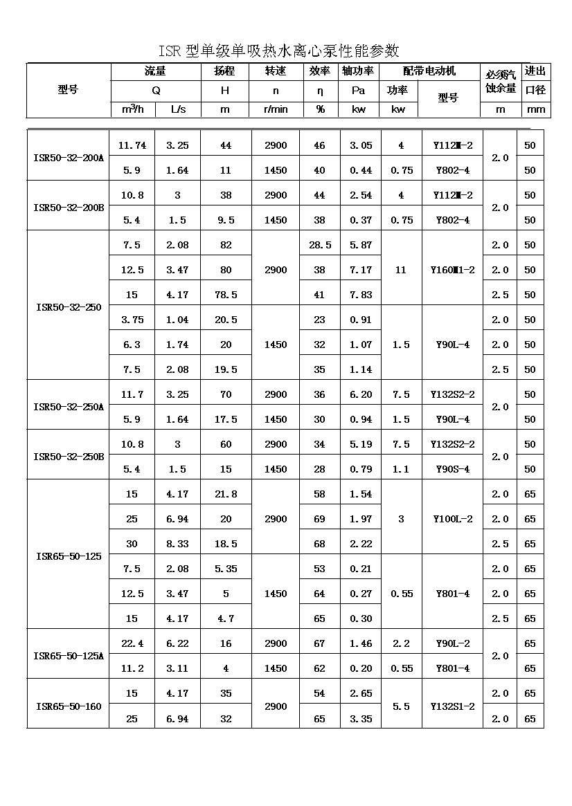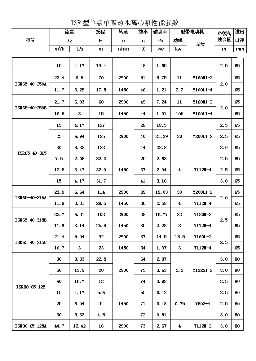 ISR系列單級單吸熱水離心泵適用于輸送不含固體顆粒的清水或物理化學性質類似于清水的其他液體,被輸送介質的溫度在-20℃~+150℃之間,泵的***高工作壓力布大于1.6MPa,吸入口壓力不大于0.8MPa,適用于工廠、礦山、城市給派水,特別是城鄉集中供熱、供水系統。其性能參數范圍為: